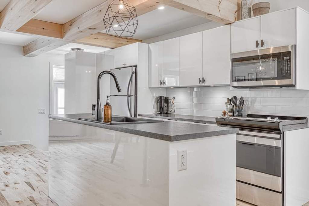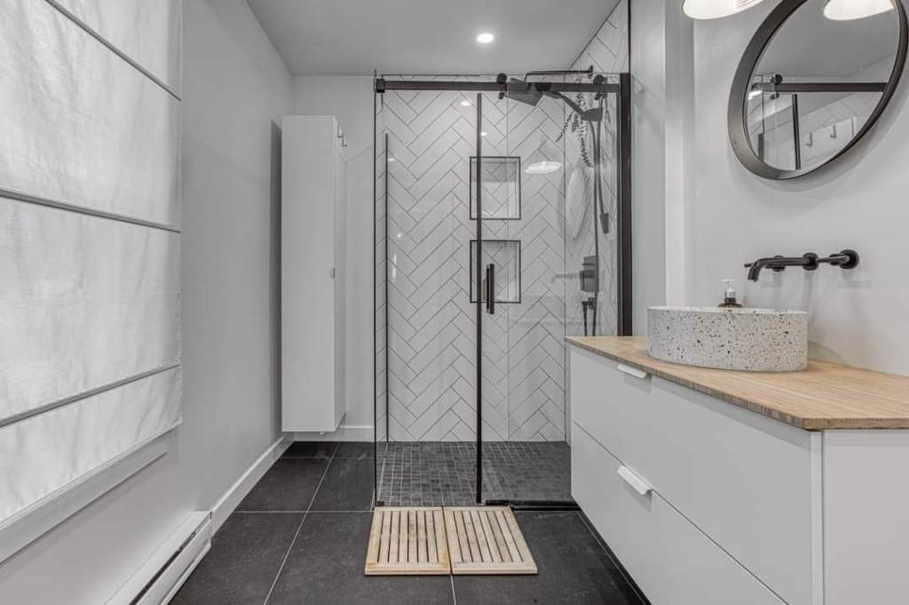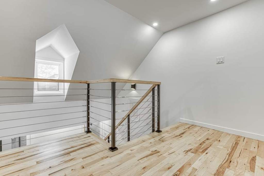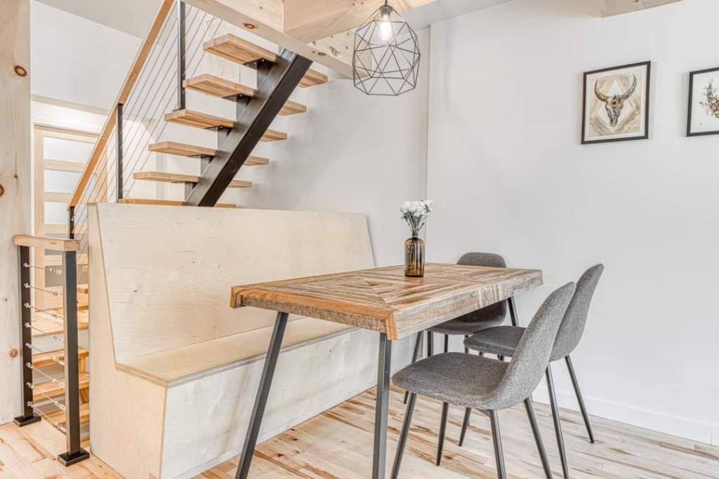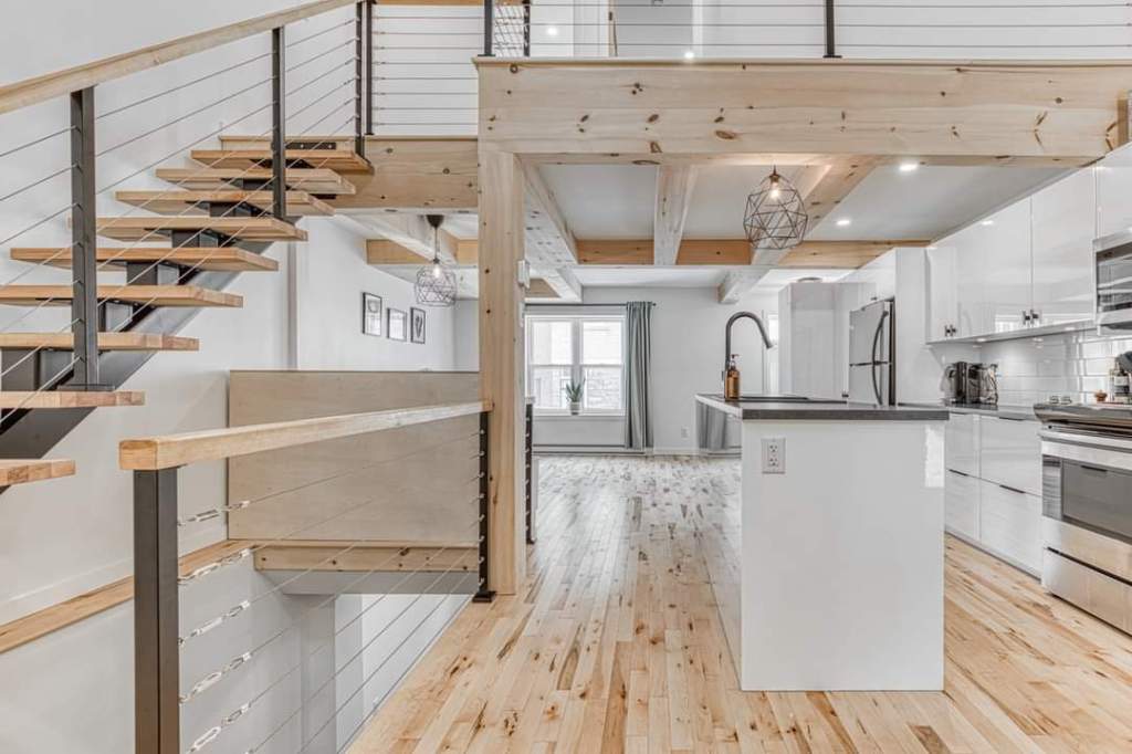 Transformation d’un duplexe en maison unifamiliale avec ajout de mezzanine, reconfiguration des espaces, amélioration structurale et agrandissement des ouvertures.