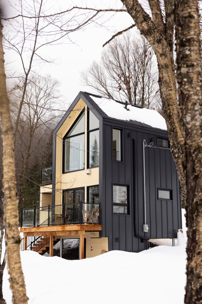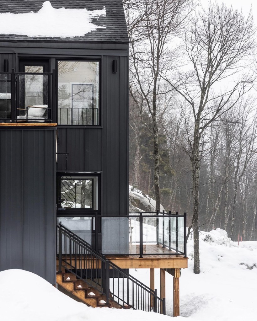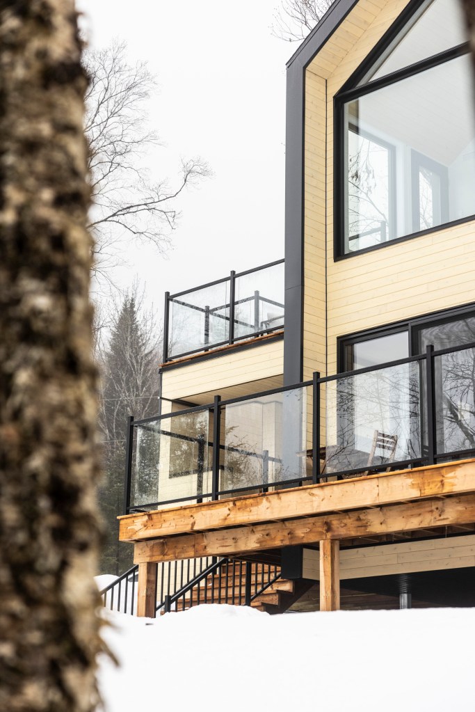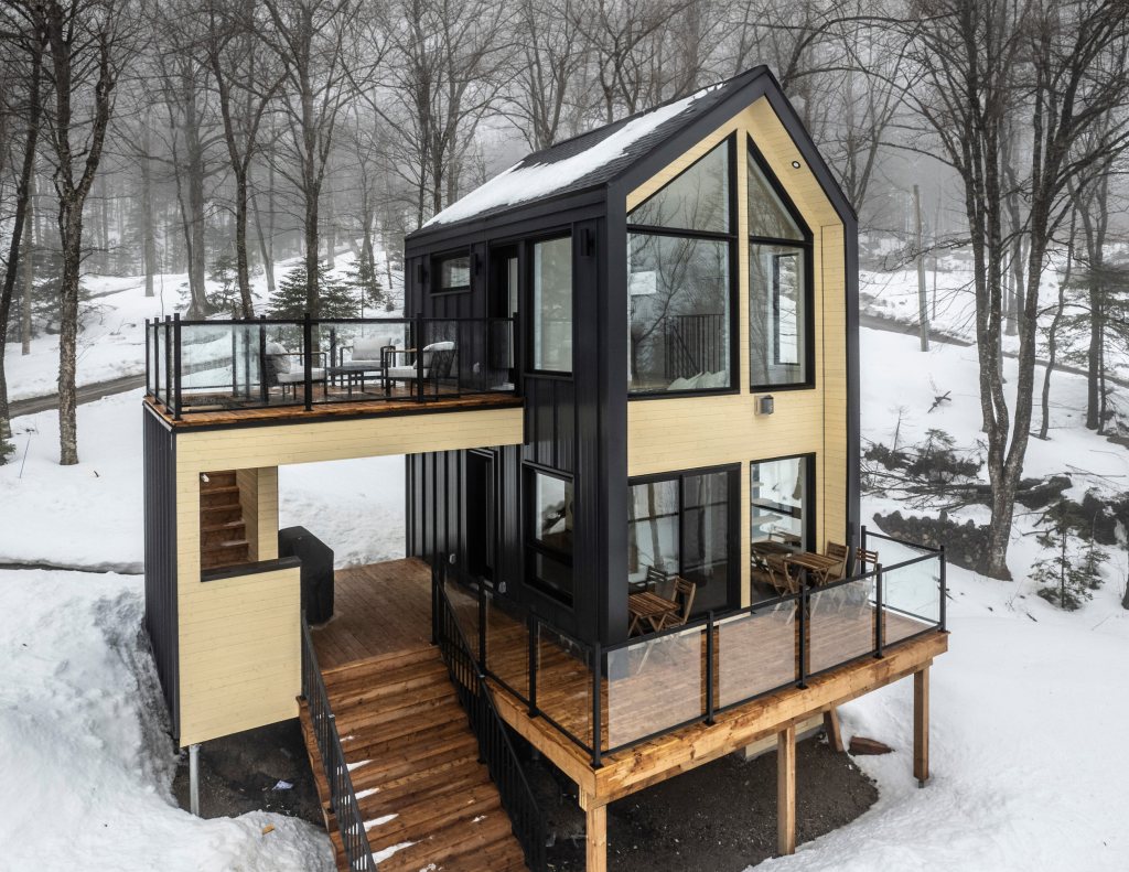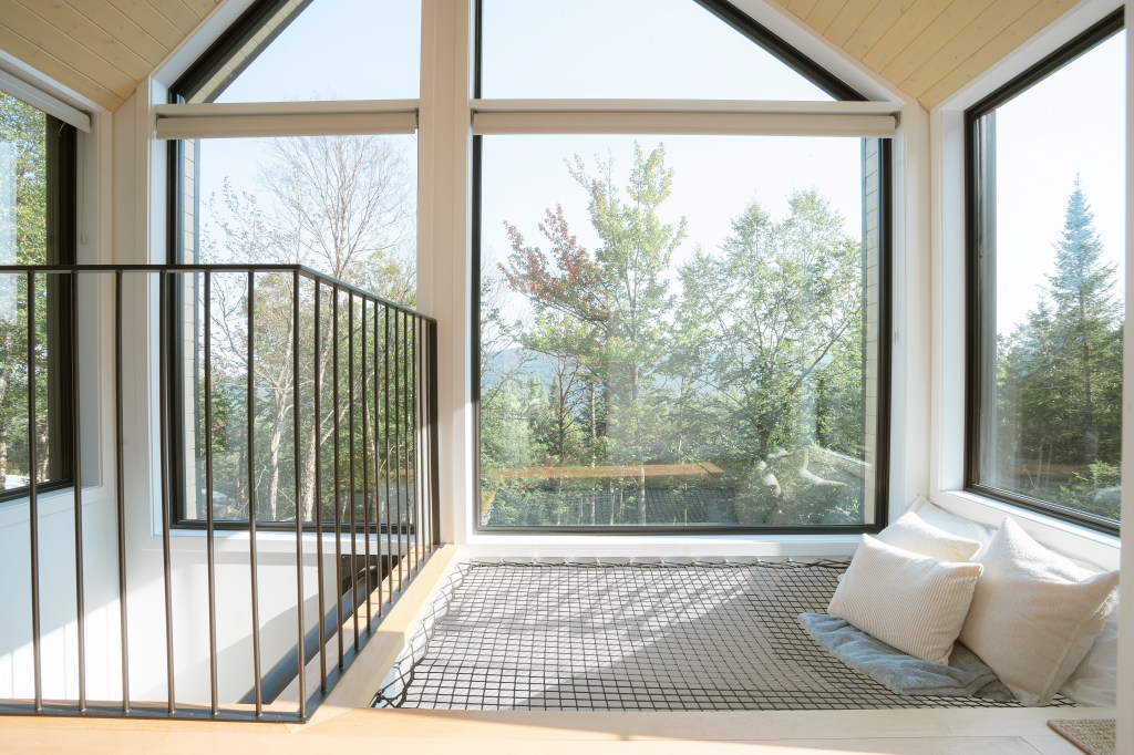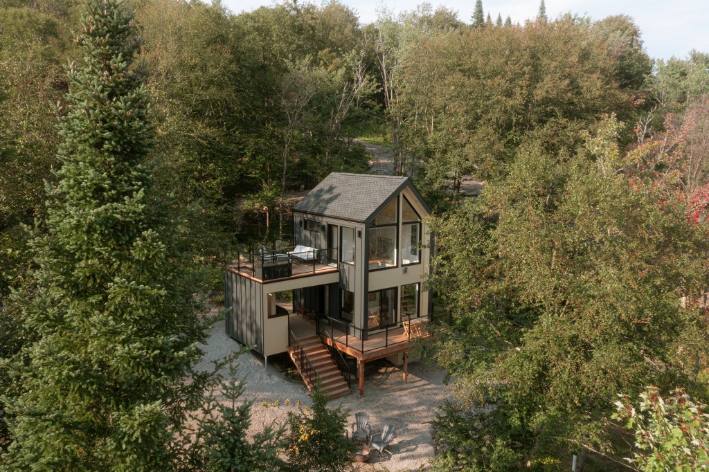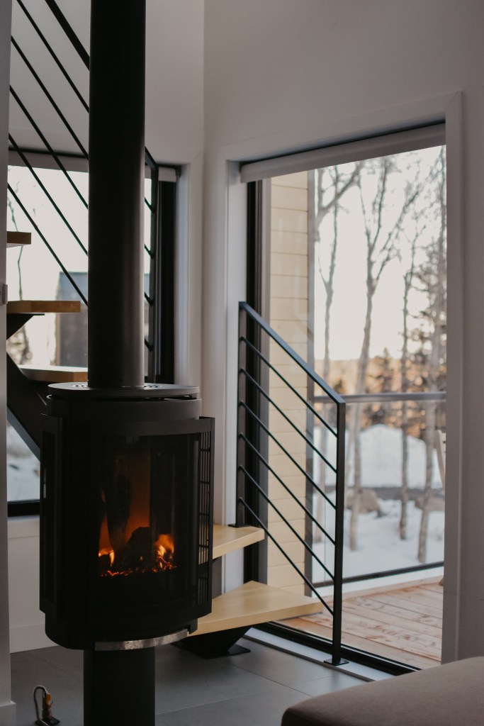 Les espaces intérieurs sont ouverts sur la forêt grâce à de larges fenêtres, assurant un apport généreux de lumière naturelle et une continuité visuelle avec le paysage. L’aménagement est volontairement épuré, mettant en valeur les matériaux et la qualité d’exécution. Le foyer au propane agit comme point d’ancrage central, contribuant au confort et à l’ambiance du lieu.